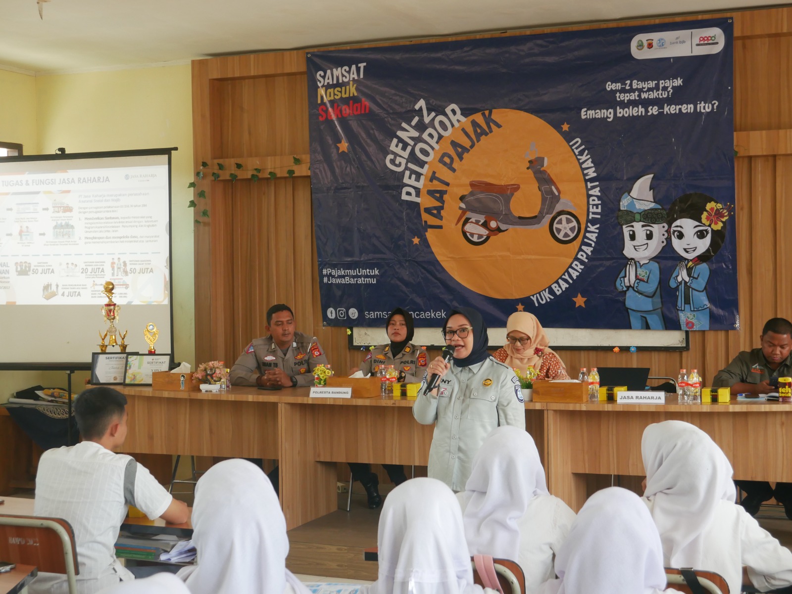 KABUPATEN BANDUNG – Hari Jumat (30/08) bertempat di SMA Negeri 1 Nagrek Kabupaten Bandung, Penanggung Jawab Jasa Raharja Samsat Rancaekek, Weny Purnamasari bersama dengan Kepala Pusat Pengelolaan Pendapatan Daerah Wilayah Kab. Bandung I Rancaekek Nenden Heniwati, SE, dan Kanit Regident Satlantas Polresta Bandung AKP Dini Kulsum melakukan sosialisasi dengan tema Gen Z Pelopor Taat Pajak di SMA Negeri 1 Nagrek Kabupaten Bandung.