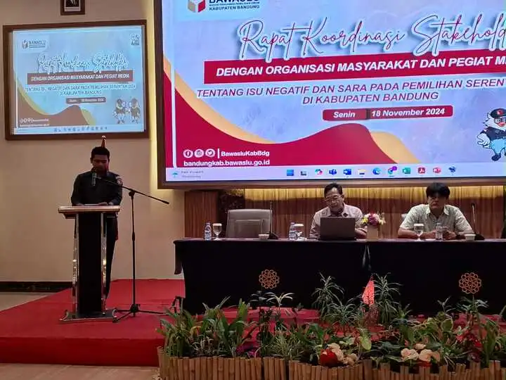 dengan Organisasi Masyarakat dan Pegiat Media tentang Isu Negatif dan SARA pada Pemilihan Serentak 2024 di Kabupaten Bandung, Senin (18/11).